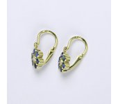 Dětské náušnice ze žlutého zlata ve tvaru kytičky se spinely a čirým zirkonem. Výška náušnice je 13 mm. Orientační váha náušnic je 1,21 g.