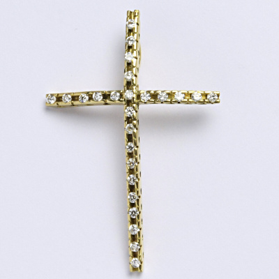 Přívěsek, křížek, je vyroben ze žlutého zlata 14 karátů 585/1000, zdobený syntetickým zirkonem. Celková velikost přívěsku je 44 mm. Při více kusech skladem je váha orientační.