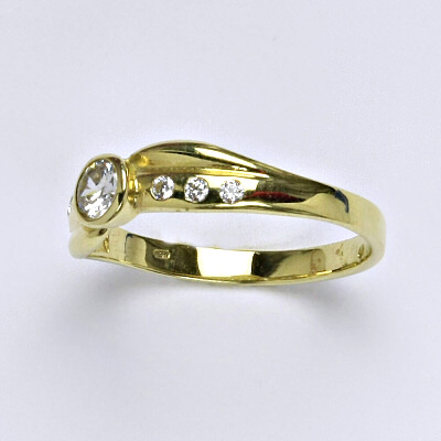 Prsten je vyrobený ze žlutého zlata, je zdobený syntetickým zirkonem 4 mm. Materiál je zlato 14 karátů 585/1000.