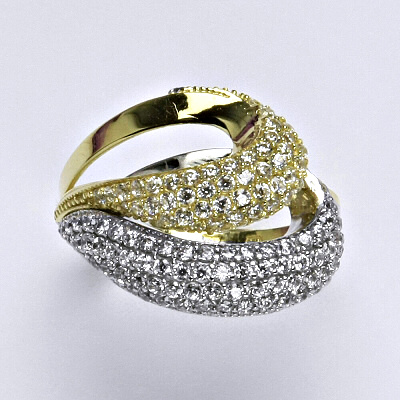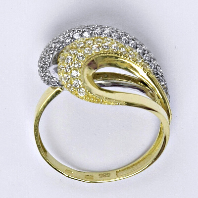 Zlatý prsten je vyrobený v kombinaci žluté a bílé zlato, zdobený syntetickým zirkonem. Velikost prstenu je 57. Materiál je zlato 14 karátů 585/1000.