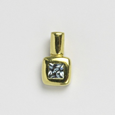 Přívěsek ze žlutého zlata s akvamarínem syntetickým, celková výška přívěsku včetně ouška je 15 mm. Meteriál je žluté zlato 585/1000