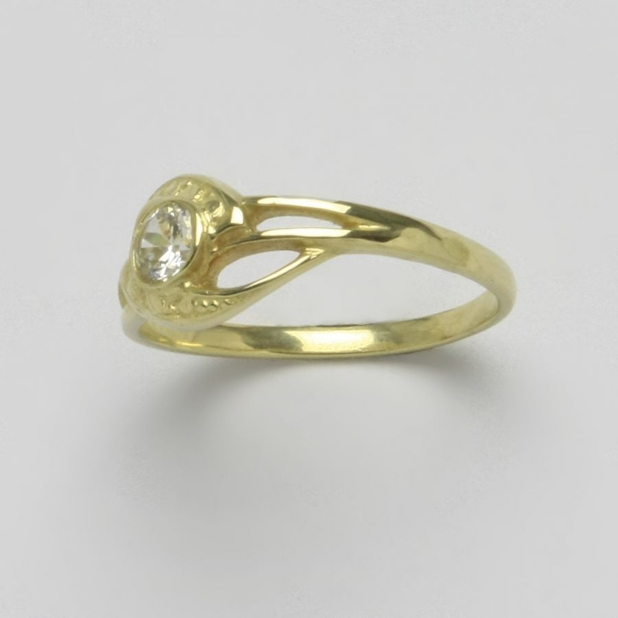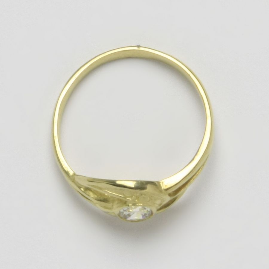 Zlatý prsten s čirým zirkonem. Velikost zirkonu je 4 mm. Materiál je zlato 585/1000. Váha cca 2,11 g.