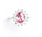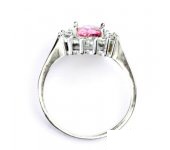 Prstýnek z bílého zlata je zdoben malými čirými zirkony a růžovým zirkonem o rozměru 8x6 mm. Materiál je zlato 585/1000. Orientační váha prstenu ve velikosti 54 je 3,05 g. Prsten nabízíme v různých velikostech.