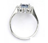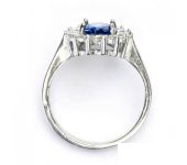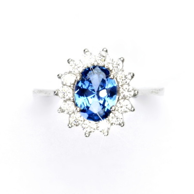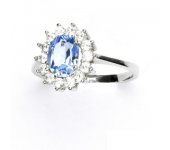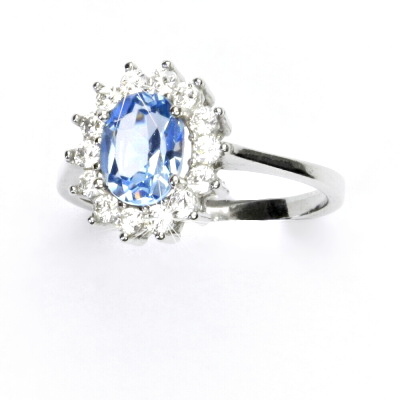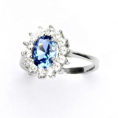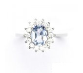 Prstýnek z bílého zlata je zdoben malými čirými zirkony a zirkonem v barvě akvamarinu o rozměru 8x6 mm. Materiál je zlato 585/1000. Orientační váha prstenu ve velikosti 54 je 3,05 g. Prsten nabízíme v různých velikostech.