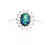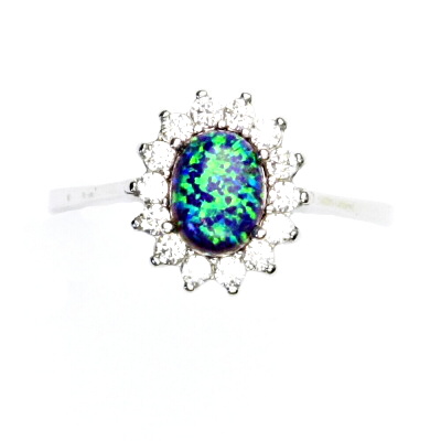Prstýnek z bílého zlata je zdoben malými čirými zirkony a syntetickým zeleným opálem o rozměru 8x6 mm. Materiál je zlato 585/1000. Orientační váha prstenu ve velikosti 54 je 3,05 g.