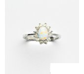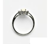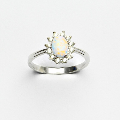 Zlatý prsten Kate, bílý syntetický opál a čiré zirkony, bílé zlato ryzosti 585/1000.
