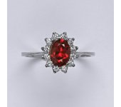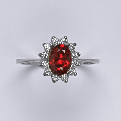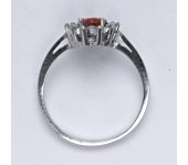 Zlatý prsten s oranžovým zirkonem a malými čirými zirkony. Velikost zirkonu je 7x5 mm. Materiál je bílé zlato 585/1000. Orientační váha prstenu ve velikosti 54 je 2,37 g.