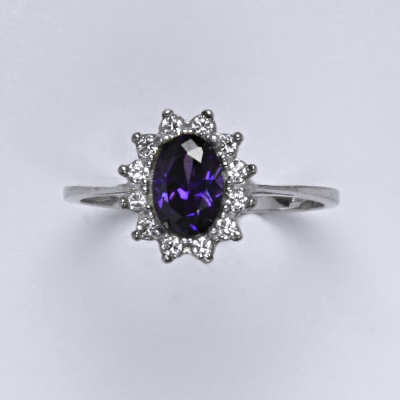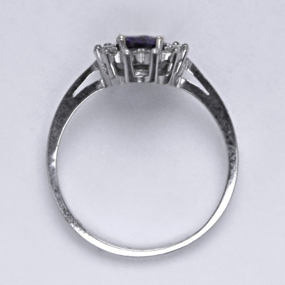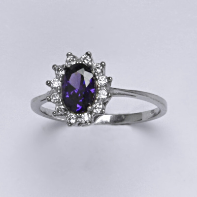 Zlatý prsten se zirkonem v barvě ametystu a malými čirými zirkony. Velikost ametystu zirkonu je 7x5 mm. Materiál je bílé zlato 585/1000. Orientační váha prstenu ve velikosti 54 je 2,37 g.