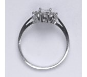 Zlatý prsten s čirým zirkonem o velikosti 7x5 mm a malými čirými zirkony. Materiál je bílé zlato 585/1000. Orientační váha prstenu ve velikosti 54 je 2,37 g.