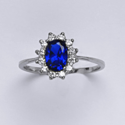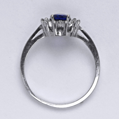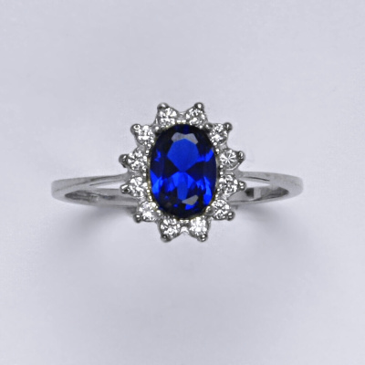 Zlatý prsten se zirkonem spinel a malými čirými zirkony. Velikost spinelu zirkonu je 7x5 mm. Materiál je bílé zlato 585/1000. Orientační váha prstenu ve velikosti 54 je 2,37 g.