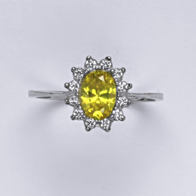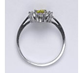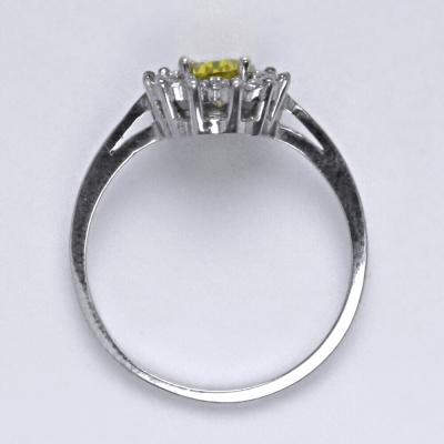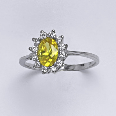 Zlatý prsten se žlutým zirkonem a malými čirými zirkony. Velikost žlutého zirkonu je 7x5 mm. Materiál je bílé zlato 585/1000. Orientační váha prstenu ve velikosti 54 je 2,37 g.
