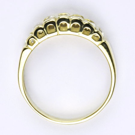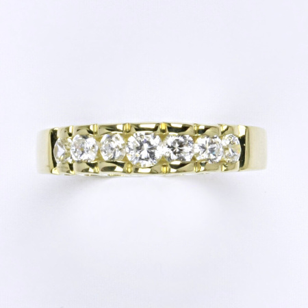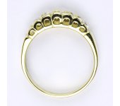Zlatý prsten ze žlutého zlata s čirými zirkony. Orientační váha prstenu je 4,67 g.