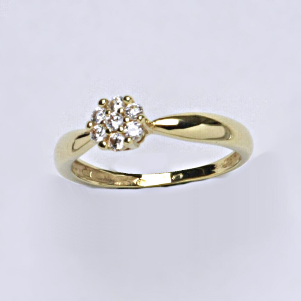 Prsten ze žlutého zlata 585/1000. Použité zirkony velikosti 2 mm. Orientační váha cca 2,2 g.