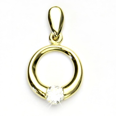 Přívěsek ze žlutého zlata s čirým o průměru 4,75 mm. Materiál je zlato 585/1000. Orientační váha přívěsku je 2,54 g. Rozměr přívěsku je 25 mm včetně úchytu na výšku a 14 mm na šířku.