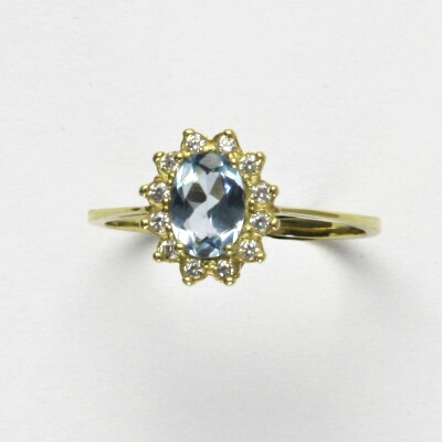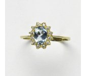 Prsten je vyroben ze žlutého zlata. Je zdoben světlým syntetickým akvamarinem o rozměru 7x5 mm a malými čirými zirkony. Materiál je zlato 585/1000. Orientační váha prstenu ve velikosti 54 je 2,37 g.