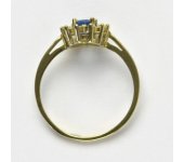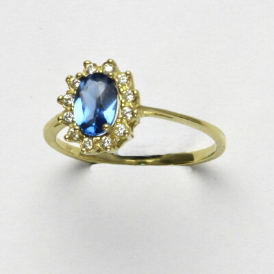 Prsten je vyroben ze žlutého zlata. Je zdoben tmavým syntetickým akvamarinem o rozměru 7x5 mm a malými čirými zirkony. Materiál je zlato 585/1000. Orientační váha prstenu ve velikosti 54 je 2,37 g.