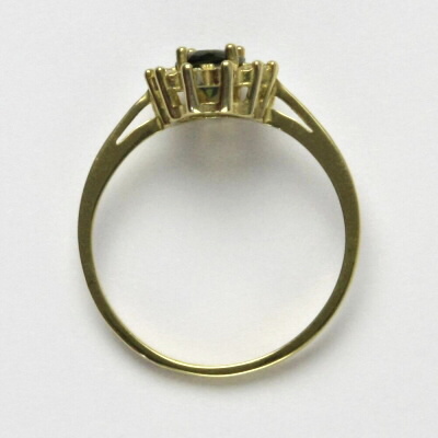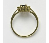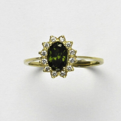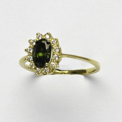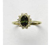 Prsten je vyroben ze žlutého zlata. Je zdoben syntetickým olivínem o rozměru 7x5 mm a malými čirými zirkony. Materiál je zlato 585/1000. Orientační váha prstenu ve velikosti 54 je 2,37 g.