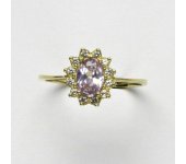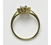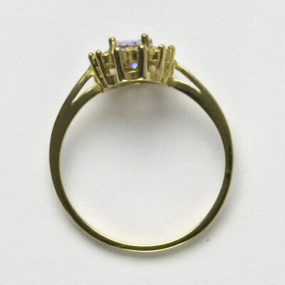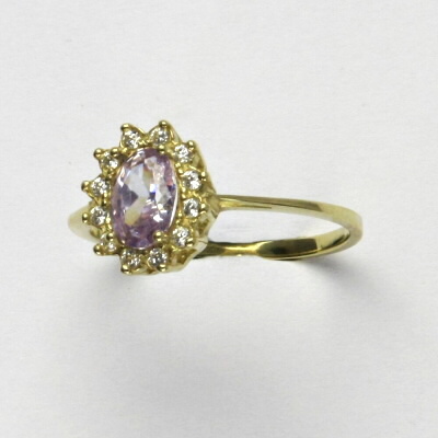 Prsten je vyroben ze žlutého zlata. Je zdoben zirkonem - lavender o rozměru 7x5 mm a malými čirými zirkony. Materiál je zlato 585/1000. Orientační váha prstenu ve velikosti 54 je 2,37 g.