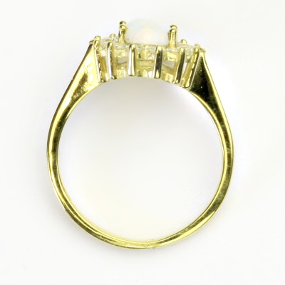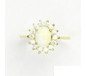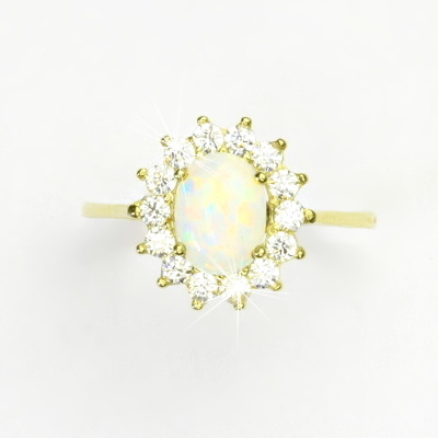 Prstýnek ze žlutého zlata je zdoben malými čirými zirkony a syntetickým bílým opálem o rozměru 8x6 mm. Materiál je zlato 585/1000. Orientační váha prstenu ve velikosti 54 je 3,05 g. Prsten nabízíme v různých velikostech.