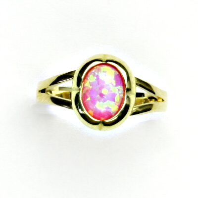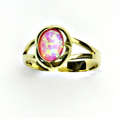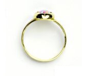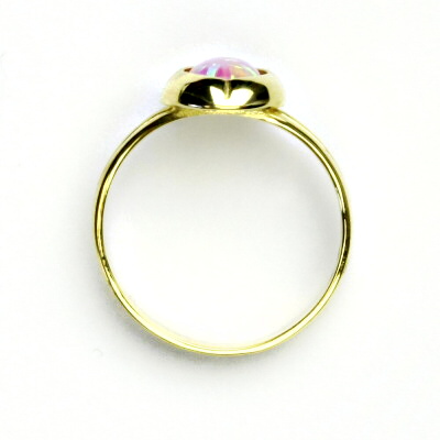 Prstýnek ze žlutého zlata je zdoben růžovým syntetickým opálem o rozměru 7x5 mm. Orietnační váha prstenu ve velikosti 54 je 3,21 g. Prstýnek nabízíme v různých velikostech. Materiál je zlato 585/1000.