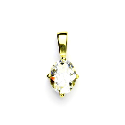 Přívěsek ze žlutého zlata s čirým zirkonem o rozměru 8x6 mm. Materiál je zlato 585/1000. Orientační váha přívěsku je 1,41 g. Rozměr přívěsku je 6 mm včetně úchytu na výšku a 8 mm na šířku.