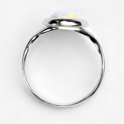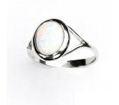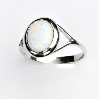 Prstýnek z bílého zlata je zdoben bílým syntetickým opálem o rozměru 10x8 mm. Materiál je zlato 585/1000. Orientační váha prstenu ve velikosti 53 je 3 g.