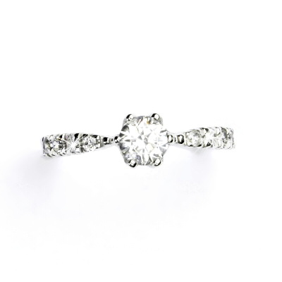 Prstýnek z bílého zlata je zdoben čirými zirkony, největší má průměr 5 mm. Materiál je zlato 585/1000. Orientační váha prstenu ve velikosti 54 je 2,37 g.