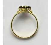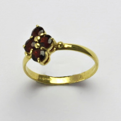 Prsten je vyroben ze žlutého zlata o ryzosti 14 karátů 585/1000. Orientační váha je 2,06 g. Prsten je zdoben přírodními granáty. Skladem máme prsten ve velikosti 54.