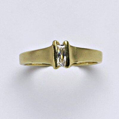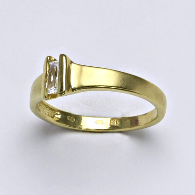 Prsten je vyrobený ze žlutého zlata, zdobený syntetickým zirkonem o rozměru 2 x 5 mm. Materiál je zlato 14 karátů 585/1000.