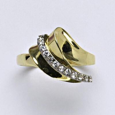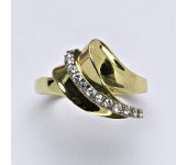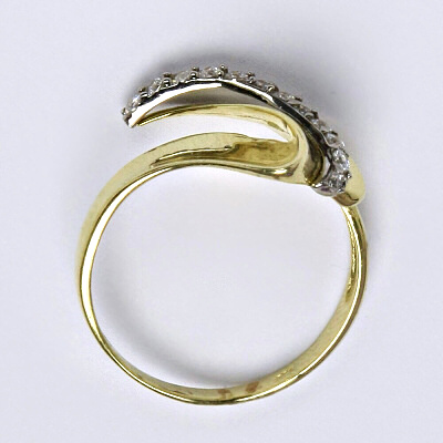 Prsten je vyrobený ze žlutého zlata, zdobený syntetickými zirkony. Materiál je zlato 14 karátů 585/1000.