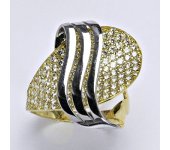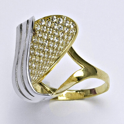 Zlatý prsten je vyrobený v kombinaci žluté a bílé zlato, zdobený syntetickým zirkonem. Velikost prstenu je 58. Materiál je zlato 14 karátů 585/1000.