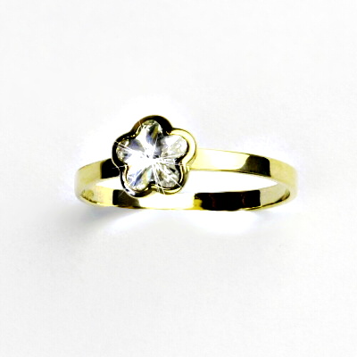 Prstýnek ze žlutého zlata se Swarovski krytalem ve tvaru kytičky. Barva krystalu - čirý. Materiál je zlato 585/1000. Orientační váha prstenu ve velikosti 51 je 1,23 g.