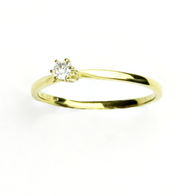 Prstýnek ze žlutého zlata je zdoben čirým zirkonem o průměru 3 mm. Materiál je zlato 585/1000. Orientační váha prstenu ve velikosti 54 je 1,12 g.