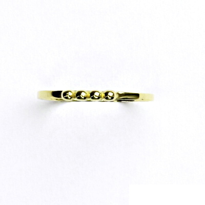 Prstýnek ze žlutého zlata je zdoben čtyřmi zlatými kuličkami. Materiál prstenu je zlato ryzosti 585/1000. Orientační váha prstenu ve velikosti 54 je cca 0,84 g.