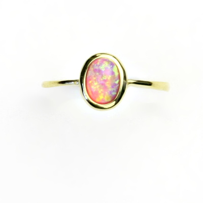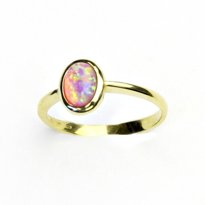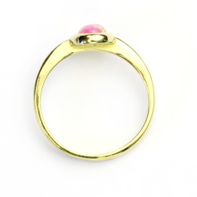 Prstýnek ze žlutého zlata je zdoben růžovým syntetickým opálem o rozměru 7x5 mm. Materiál je zlato 585/1000. Orientační váha prstenu ve velikosti 54 je 2,39 g.
