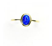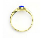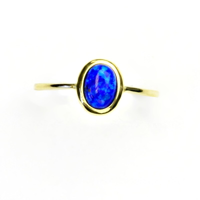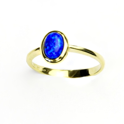 Prstýnek ze žlutého zlata je zdoben tmavě modrým syntetickým opálem o rozměru 7x5 mm. Materiál je zlato 585/1000. Orientační váha prstenu ve velikosti 54 je 2,39 g.