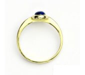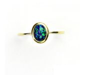 Prstýnek ze žlutého zlata je zdoben zeleným syntetickým opálem o rozměru 7x5 mm. Materiál je zlato 585/1000. Orientační váha prstenu ve velikosti 54 je 2,39 g.