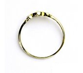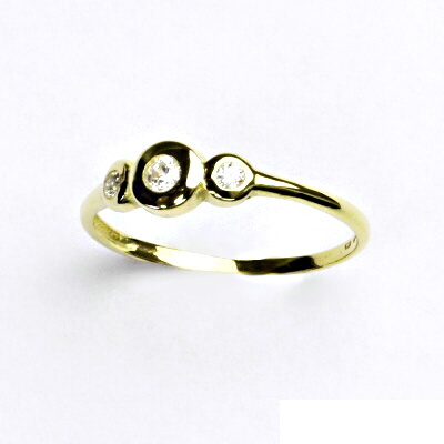 Prstýnek ze žlutého zlata je zdoben třemi zirkony čirými zirkony o průměru 2 mm a 2,9 mm. Materiál prstenu je zlato ryzosti 585/1000. Orientační váha prstenu ve velikosti 60 je cca 1,40 g.