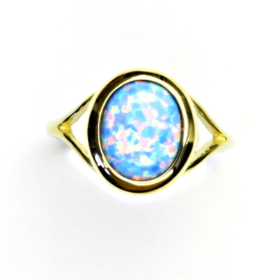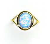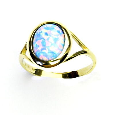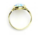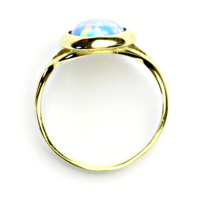Prstýnek z bílého zlata je zdoben světle modrým syntetickým opálem o rozměru 10x8 mm. Materiál je zlato 585/1000. Orientační váha prstenu ve velikosti 53 je 3 g.