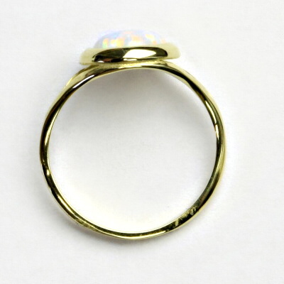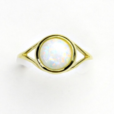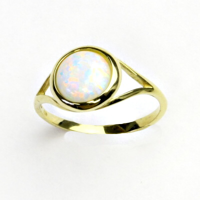 Prstýnek ze žlutého zlata je zdoben bílým syntetickým opálem o průměru 8 mm. Materiál je zlato 585/1000. Orientační váha prstenu ve velikosti 54 je 2,31 g.