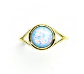 Prstýnek ze žlutého zlata je zdoben světle modrým syntetickým opálem o průměru 8 mm. Materiál je zlato 585/1000. Orientační váha prstenu ve velikosti 54 je 2,31 g.