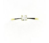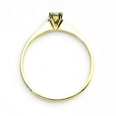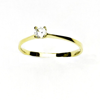 Prstýnek ze žlutého zlata je zdoben čirým zirkonem o průměru cca 3,5 mm. Materiál je zlato 585/1000. Orientační váha prstenu ve velikosti 54 je 1,06 g. Prstýnek je vhodný i jako zásnubní.