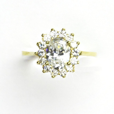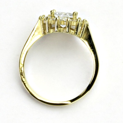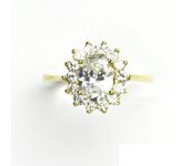 Prstýnek ze žlutého zlata je zdoben čirými zirkony, největší má rozměr 8x6 mm. Materiál je zlato 585/1000. Orientační váha prstenu ve velikosti 54 je 3,05 g. Prsten nabízíme v různých velikostech.