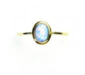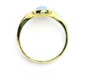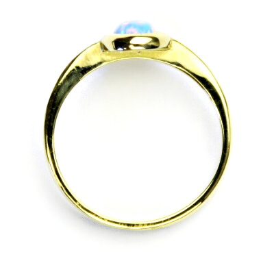 Prstýnek ze žlutého zlata je zdoben světle modrým syntetickým opálem o rozměru 7x5 mm. Materiál je zlato 585/1000. Orientační váha prstenu ve velikosti 54 je 2,39 g.