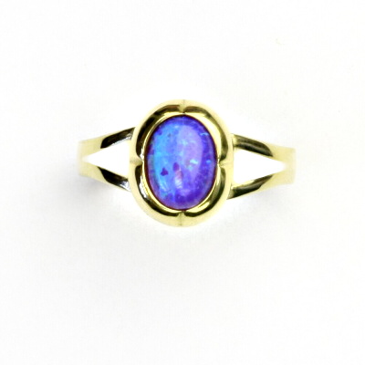 Prstýnek ze žlutého zlata je zdoben fialovým syntetickým opálem o rozměru 7x5 mm. Orietnační váha prstenu ve velikosti 54 je 3,21 g. Prstýnek nabízíme v různých velikostech. Materiál je zlato 585/1000.