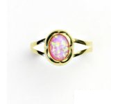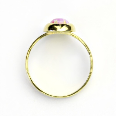 Prstýnek ze žlutého zlata je zdoben růžovým syntetickým opálem o rozměru 7x5 mm. Orietnační váha prstenu ve velikosti 54 je 3,21 g. Prstýnek nabízíme v různých velikostech. Materiál je zlato 585/1000.
