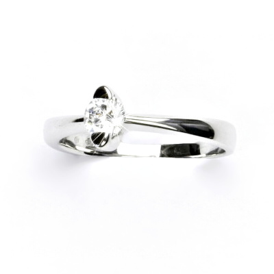 Prstýnek z bílého zlata je zdoben čirým zirkonem o průměru 4,75 mm. Materiál je zlato 585/1000. Je vhodný i jako zásnubní prsten. Orientační váha prstenu ve velikosti 54 je 2,74 g.