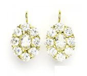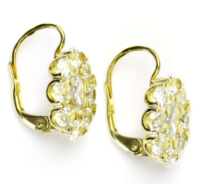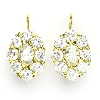 Náušnice ze žlutého zlata jsou zdobeny čirými zirkony. Materiál je zlato 585/1000. Orientační váha náušnic je 5,91 g. Celková výška náušnice je 18 mm. Šířka náušnice je 12 mm. Náušnice mají zapínání na klapku.