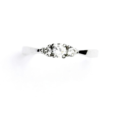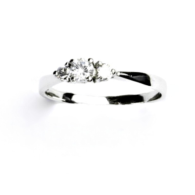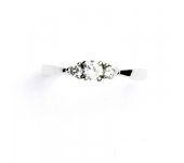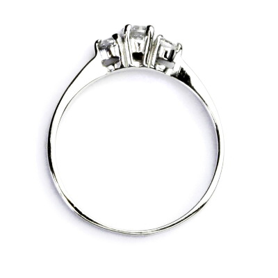 Prstýnek z bílého zlata je zdoben čirými zirkony o průměru 2,5 mm a 3,5 mm.Materiál je zlato 585/1000. Orientační váha prstenu ve velikosti 54 je 1,72 g. Je vhodný i jako zásnubní prsten.