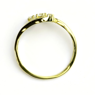 Prstýnek ze žlutého zlata je zdoben čirými zirkony o průměru 1,5 mm a 2,75 mm. Materiál je zlato 585/1000. Orientační váha prstenu ve velikosti 54 je 1,71 g.